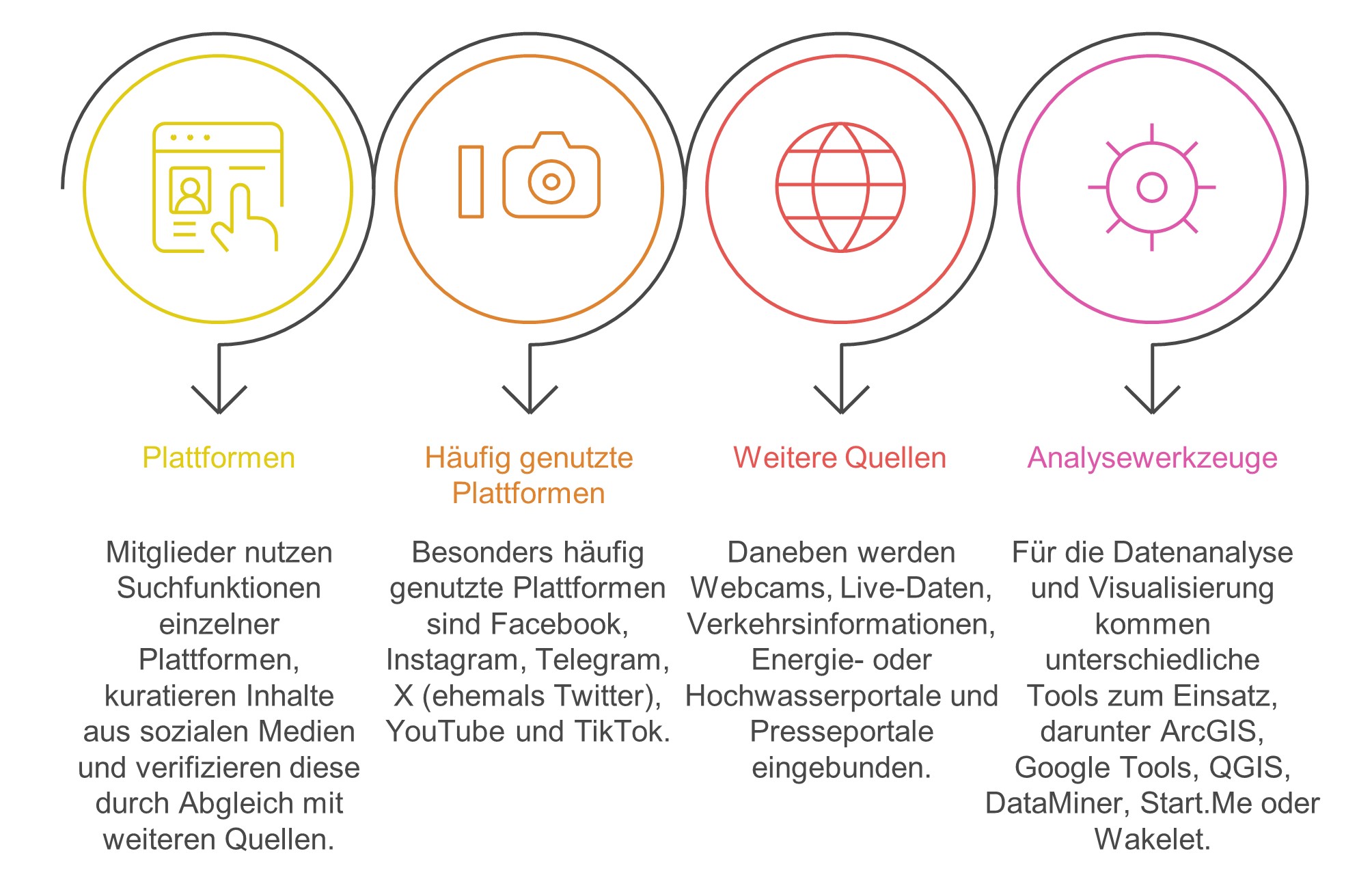 Die Datenbeschaffung durch VOST erfolgt manuell, technisch unterstützt und lageabhängig. Dabei nutzen die Mitglieder Suchfunktionen einzelner Plattformen, kuratieren Inhalte aus sozialen Medien und verifizieren diese durch Abgleich mit weiteren Quellen. Besonders häufig genutzte Plattformen sind Facebook, Instagram, Telegram, X (ehem. Twitter), YouTube und TikTok. Daneben werden Webcams, Live-Daten, Verkehrsinformationen, EnergieoderHochwasserportale und Presseportale eingebunden. Die lokale Verankerung spielt hierbei eine wesentliche Rolle: Mitglieder mit regionalem Bezug oder aus Behörden und Organisationen mit Sicherheitsaufgaben können Informationen besser verifizieren und regionale Kontexteinterpretieren. Für die Datenanalyse und Visualisierung kommen unterschiedliche Tools zum Einsatz, darunter ArcGIS, Google Tools, QGIS, DataMiner, Start.Me oder Wakelet. Diese Werkzeuge ermöglichen die systematische Aufbereitung, Kartierung und Priorisierung relevanter Daten. Herausforderungen ergeben sich durch die hohe Dynamik der digitalen Plattformen und die Notwendigkeit regelmäßiger Software-Updates, um die Funktionalitätund Datensicherheit auf aktuellem Stand zu halten. Eine zusammenfassende Darstellung findet sich in Abbildung 2.