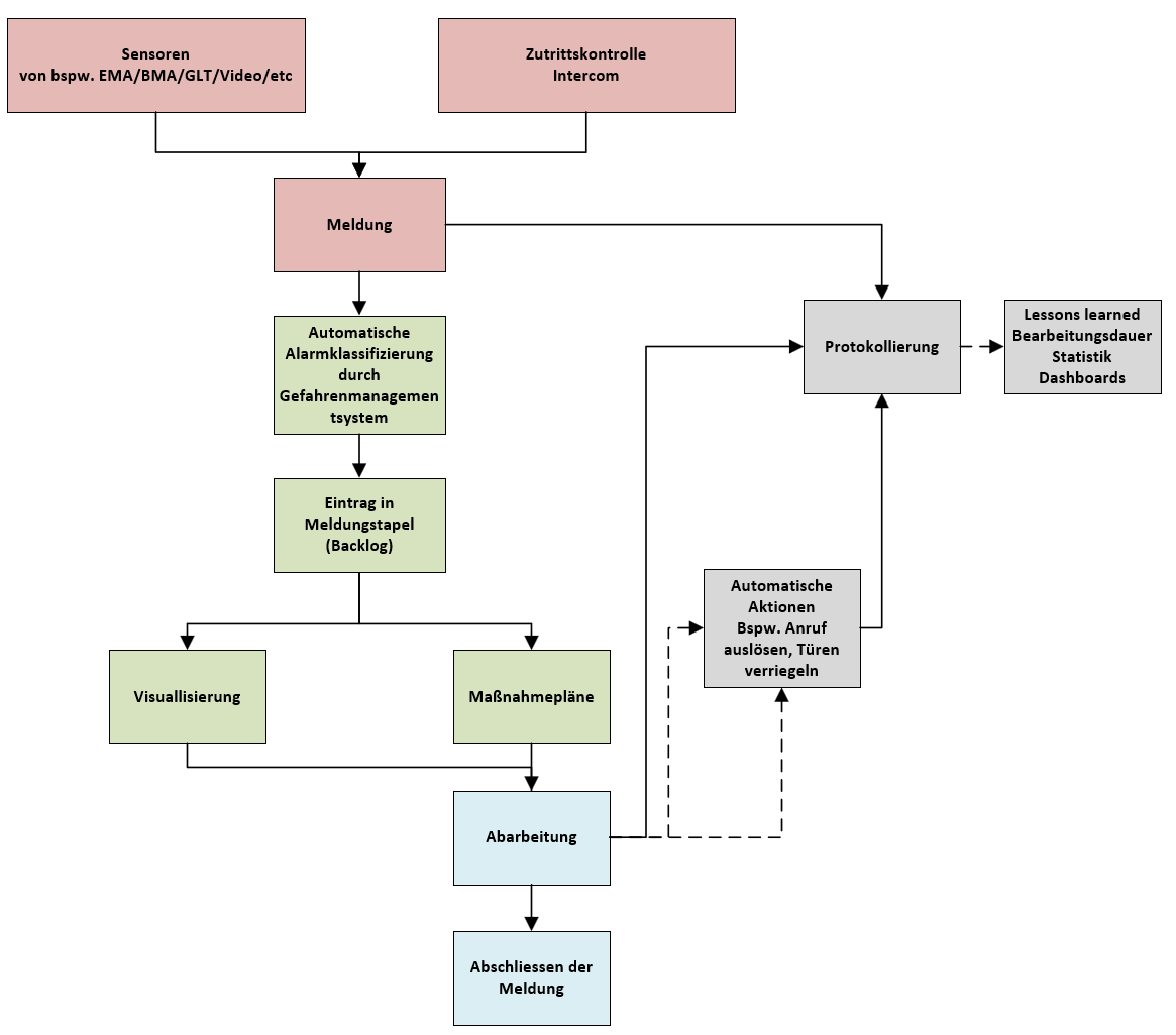 Die Arbeit in Sicherheitsleitstellen verlangt von den Verantwortlichen kontinuierliche Konzentration, während sie einer Vielzahl von Stressfaktoren ausgesetzt sind. Dazu zählen Umweltfaktoren wie Hitze, Lärm und Luftqualität, technische Störungen oder Alarme, die das strikte Einhalten von Protokollen und Prozessabläufen bei sicherheitsrelevanten Vorfällen erfordern. Insbesondere der letztgenannte Aspekt ist ein häufiger Stressfaktor, denn selbst hinter vermeintlich simplen Standardaufgaben stehen oft komplexe Informations- und Entscheidungsprozesse, wie das Schema auf der nachfolgenden Seite zeigt.
